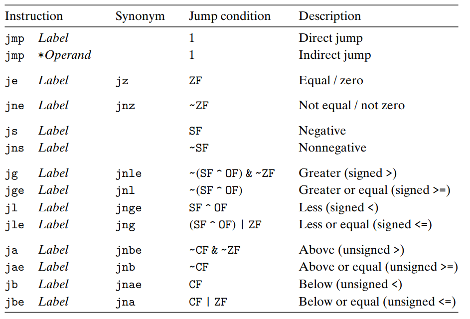 - jump .L1 (직접 점프)명령어는 밑에 movq 명령어를 skip하고 popq 명령어로 재개한다. 오브젝트-코드 파일을 생성하여, 어셈블러는 모든 라벨된(labeled) 명령어의 주소를 결정하고 jump 타겟을 jump 명령어의 한 부분으로 인코딩한다.