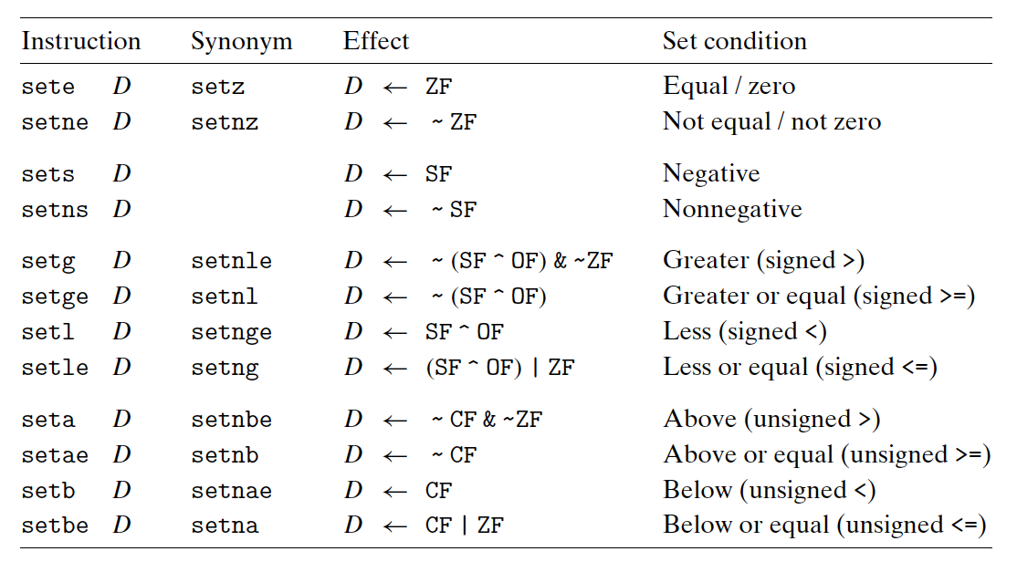 - 조건 코드의 어떤 조합에 의존하여 단일 바이트를 0또는 1로 설정한다.