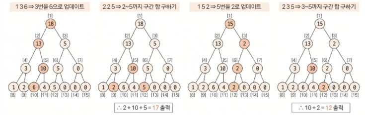 - 구간 합에서는 원래 데이터와 변경 데이터의 차이만큼 부모 노드로 올라가면서 변경한다.