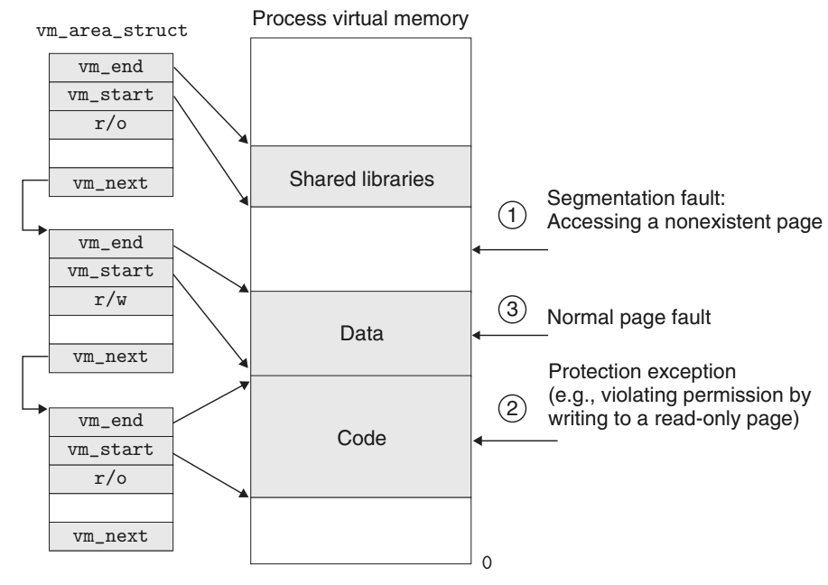 MMU가 어떤 가상주소 A를 번역하려고 하는 동안에 페이지 오류를 유발한다고 가정하자. 이 예외는 커널의 페이지 오류 핸들러로 제어를 이동하게 되며, 이후에 다음과 같은 단계를 수행한다.