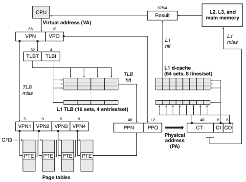 번역 참조 버퍼Translation Lookaside Buffer(이하 TLB)는 각 줄이 단일 PTE으로 구성된 작은 가상 주소 캐시이다. TLB는 일반적으로 높은 연관성을 가진다. 위 그림에서 보듯이, 세트 선택과 줄 일치를 위해 사용되는 인덱스와 태그 필드는 가상 주소의 가상 페이지 번호(VPN)에서 추출된다. TLB에 T = 2^t 세트가 있는 경우, TLB 인덱스(TLBI)는 VPN의 t 비트 중의 LSB로 구성되며, TLB 태그(TLBT)는 VPN의 나머지 비트로 구성된다.