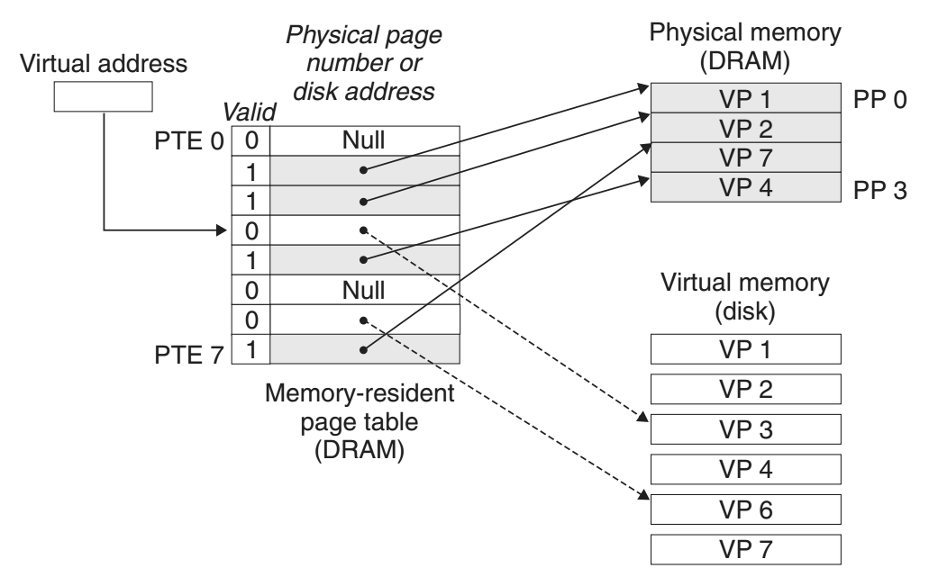 DRAM 캐시 미스는 페이지 오류Page fault라고도 부른다. CPU가 DRAM에 캐시되어 있지 않은 VP(가상페이지) 내의 워드를 참조하면, 주소 번역 HW는 메모리에서 PTEPage Table Entry를 읽으며, 해당 VP가 캐시되어 있지 않다는 것을 유효비트valid bit로부터 유추해서 페이지 오류 예외를 발생시킨다.