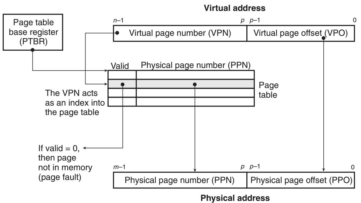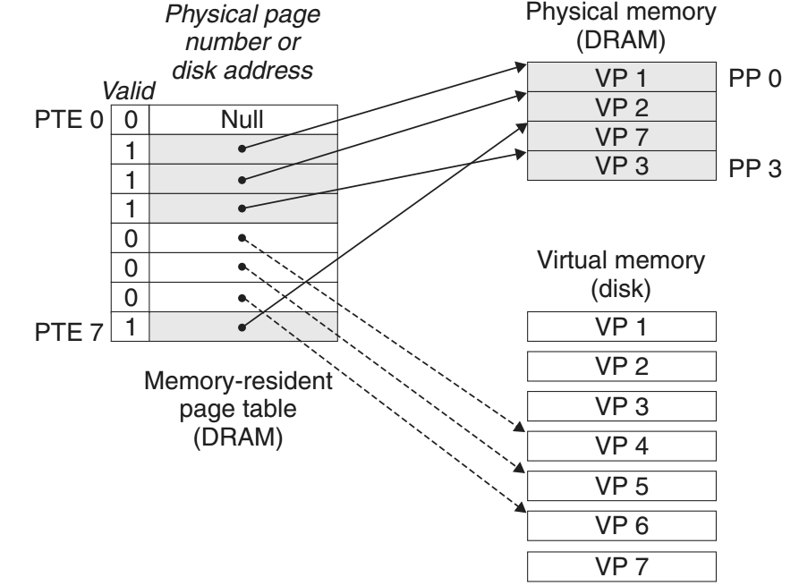 모든 캐시와 마찬가지로 VM 시스템은 가상 페이지가 DRAM 어딘가에 캐시되어 있는지를 확인할 방법이 있어야 한다. 만약 캐시되어 있다면, 시스템은 그 가상 페이지가 어떤 물리 페이지에 캐시되어 있는지를 파악해야 한다. 미스가 발생하면, 시스템은 가상 페이지가 디스크의 어디에 저장되어 있는지를 확인하고, 물리 메모리에서 희생자 페이지victim page를 선택한 다음, 디스크에서 DRAM으로 가상 페이지를 복사하여 희생자 페이지를 교체해야 한다. 이러한 기능은 운영 체제 소프트웨어, MMU의 주소 변환 HW, 그리고 가상 페이지를 물리 페이지에 매핑하는 페이지 테이블이라는 물리 메모리에 저장된 자료구조의 조합에 의해 제공된다.