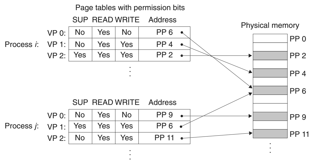 위 그림은 PTE에 허가 비트permission bits를 추가해서 주소 번역 HW가 VP 내용으로의 접근을 제어하는 모습을 보여준다.