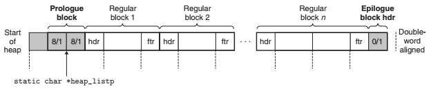 동적 메모리 할당기Dynamic memory allocator는 힙heap이라고 하는 프로세스의 가상메모리 영역을 관리한다. 여기서 힙은 미초기화된 데이터 영역 직후에서 시작해 위쪽(높은 주소 방향)으로 커지는 무요구 메모리demand-zero memory 영역이라고 가정한다. 각각의 프로세스에 대해서 커널은 힙의 Top을 가리키는 변수 brk(break)를 사용한다.