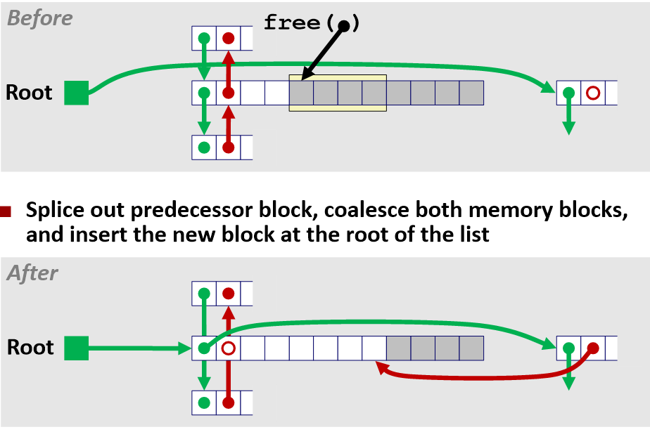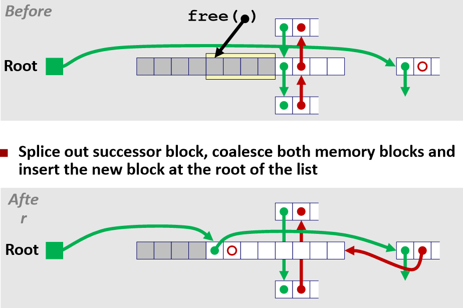 predecessor와 successor 블록을 나누고 세 메모리 블록들을 연결해서 새로운 블록을 리스트의 루트에 삽입한다.