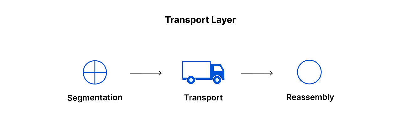 Transport: 세그먼트 전송, 오류 제어 (ex. TCP, UDP)