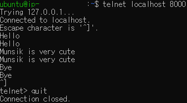 서버를 연 터미널은 그대로 두고 새로운 터미널을 열어서 EC2에 접속한 후에 클라이언트 프로그램을 실행해야 한다.