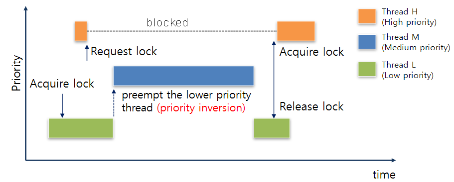 🔹 우선순위 역전: 높은 우선순위의 스레드가 낮은 우선순위의 스레드를 기다리는 현상
