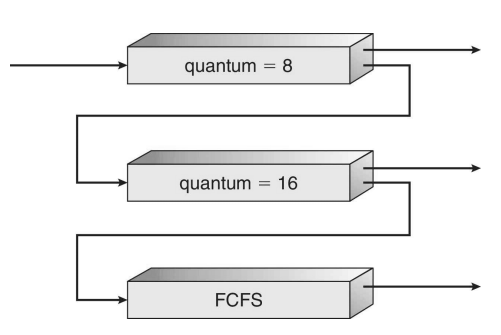 위의 그림에서 FCFS를 수행하는 어떤 태스크 J가 Q0으로 들어오면, CPU를 얻을 때 8ms동안 실행된다. 그 이후에도 끝나지 않으면 Q1으로 이동한다. Q1에서 J는 다시 FCFS를 수행하고 16ms를 받는다. 여전히 완료되지 않으면 선점되어서 Q2로 이동한다.