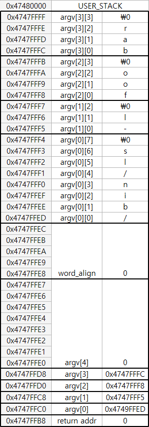 여기서 스택 포인터는 0x4747FFB8로 초기화되어 있다. 위에서 나타난 대로, 작성한 코드는 0x4748000으로 정의된 USER_STACK에서 시작해야 한다.