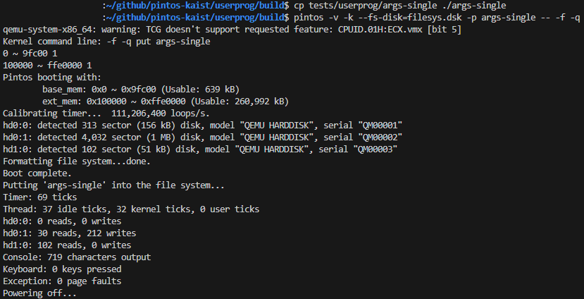 $ pintos -v -k --fs-disk=filesys.dsk -p args-single -- -f -q