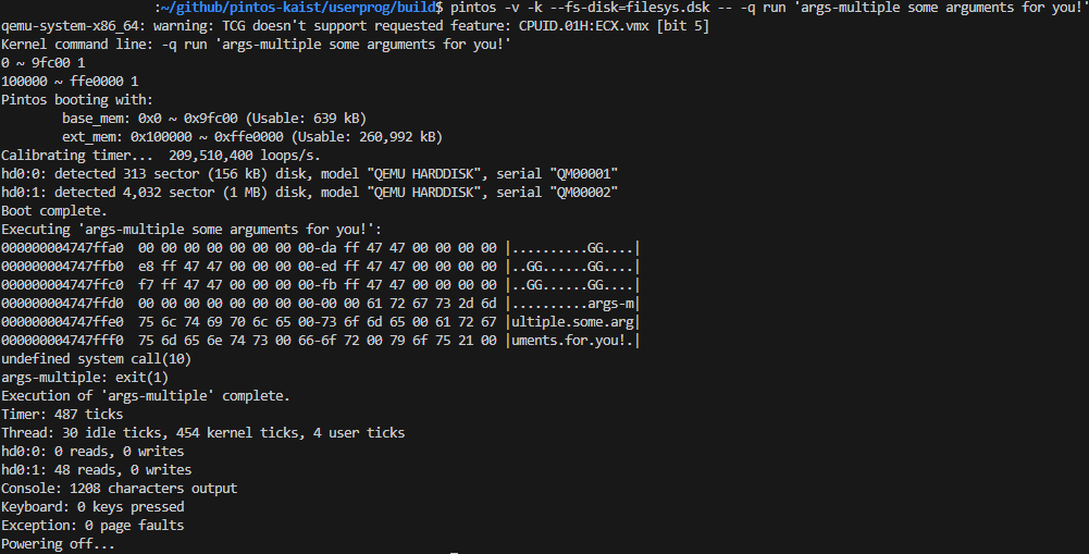 $ pintos -v -k --fs-disk=filesys.dsk -- -q run 'args-multiple some arguments for you!'