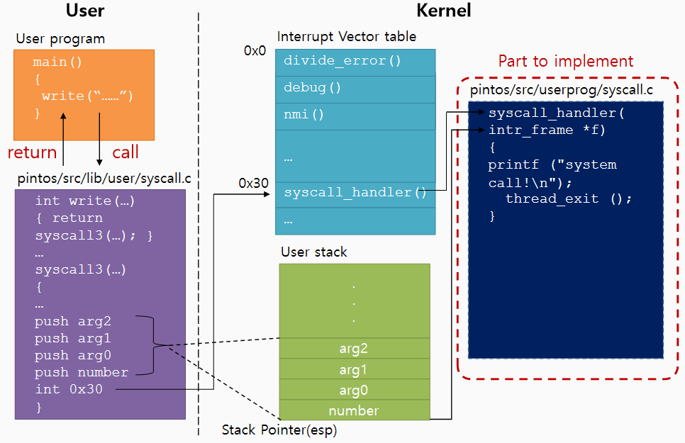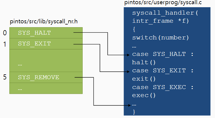 - 시스템 콜 번호를 사용해 시스템 콜 핸들러로부터 시스템 콜을 호출한다.
