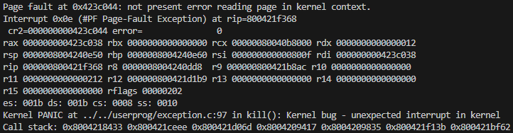 이 말은 fd = 2에 들어 있는 file 포인터가 커널 포인터가 아니라 유저 주소 (0x423C038)라는 뜻이다. 그 뒤 file_length(file)에서 이 주소를 접근하려다가 PF가 발생했고, 그게 커널 모드에서 발생했다고 판단되어 Kernel panic이 발생한 것이다.