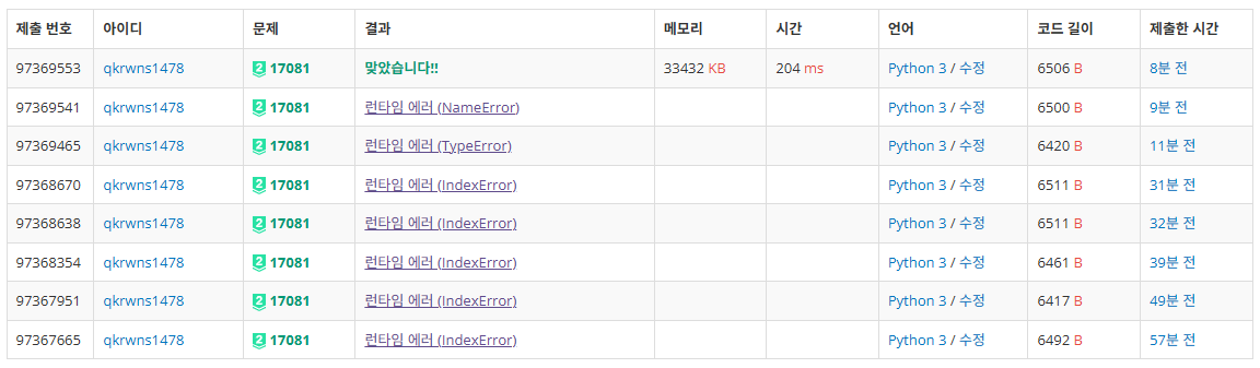게임을 개발하는 느낌으로 재미있게 풀었다. 그런데 요즘에 JS, TS만 해서 그런지 입력을 받는 부분에서 계속 IndexError가 났었다...😵
