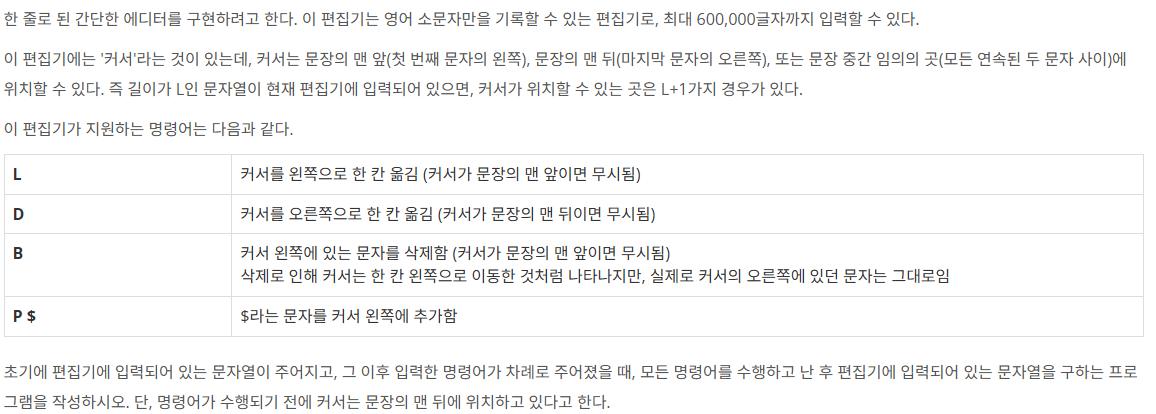 출력: 첫째 줄에 모든 명령어를 수행하고 난 후 편집기에 입력되어 있는 문자열을 출력한다.