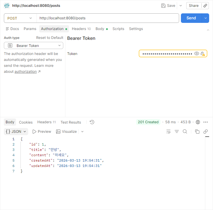 - 이후 요청 시 Authorization: Bearer 토큰값 전송
