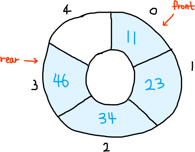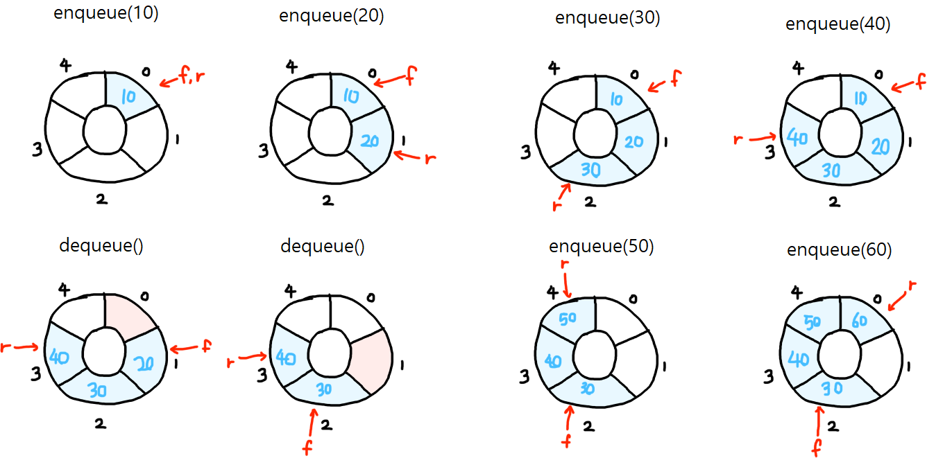 enqueue하여 요소를 삭제할 자리, dequeue하여 요소를 추가할 자리를 따로 저장한다. enqueue()를 하게 되면 rear 포인터가 앞으로 이동하고, dequeue()를 하게 되면 front포인터가 앞으로 이동한다. 이렇게 enqueue와 dequeue를 반복하게 되면 서로 둥글게 연결되어 있기 때문에 두 개의 포인터가 빙글빙글 돌면서 이동하는 구조가 된다.