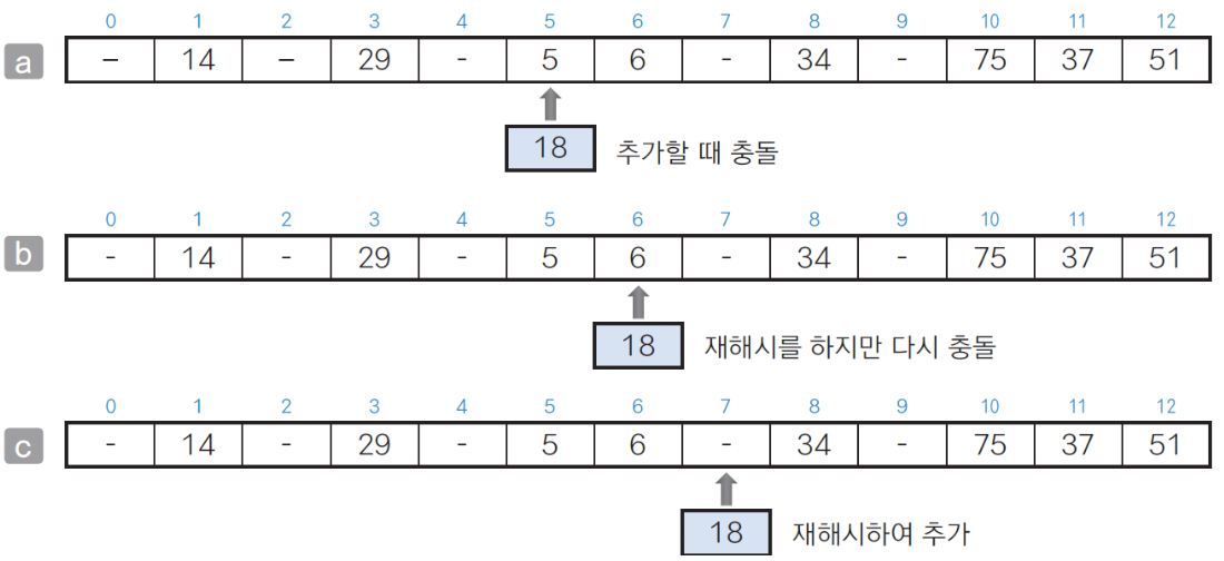 - 오픈 주소법 : 빈 버킷을 찾을 때까지 해시를 반복함