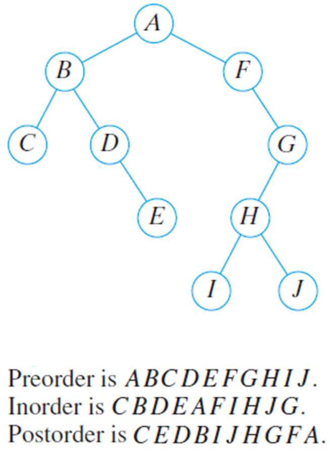 A binary tree is a rooted tree in which each vertex has either no children, one child, or two children. If a vertex has one child, that child is designated as either a left child or a right child (but not both). If a vertex has two children, one child is designated a left child and the other child is designated a right child.