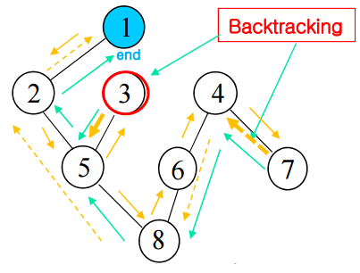 - 7과 인접하면서 탐색되지 않은 vertex가 없으므로 backtracking 발생 (4 → 6 → 8 → 5 → 2 → 1)