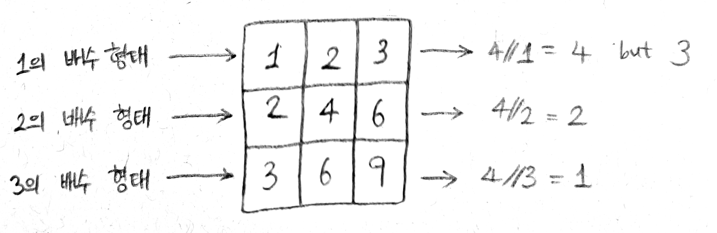 최초의 mid 값은 4이다. 각 행에서 mid 보다 작거나 같은 수의 개수는 mid 값을 각 행의 첫번째 값으로 나눈 값이다. 그 결과 각 열에서 mid=4 이하인 수는 6개가 된다. mid 이하인 수의 개수는 min(mid // i, n)으로 계산한다. 그리고 이를 통해 mid=4는 6번째 수보다 큰 수가 될 수 없다는 것을 알 수 있으며, mid=4보다 큰 범위에 정답이 있다는 것을 유추할 수 있다.