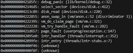 일단 backtrace한 결과를 보면 open()에서 문제가 생긴 것으로 보인다. 선배 기수 분들의 블로그에서는 시스템 콜에서 파일 시스템 관련 함수를 호출할 때 락을 걸어줘서 해결했다고 하는데, 우리 코드는 이미 파일 시스템 락을 걸고 해제하고 있는데도 page-merge 테스트들이 통과되지 못했다.