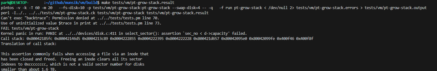 Anon page의 swap in/out을 구현한 뒤에, 이전에 pass했던 pt-grow-stack 등의 테스트가 fail이 나는 문제가 발생했다.