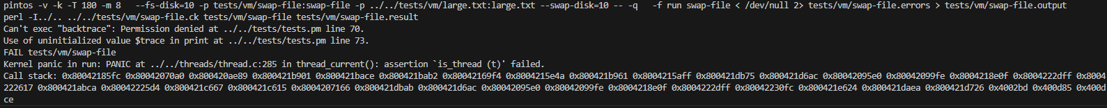 위에서 file backed 함수들을 수정했지만 여전히 swap-file 테스트를 통과하지 못하는 문제가 발생했다.